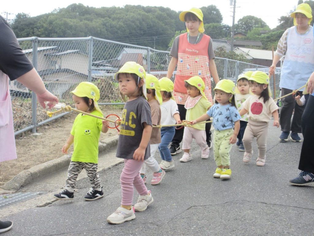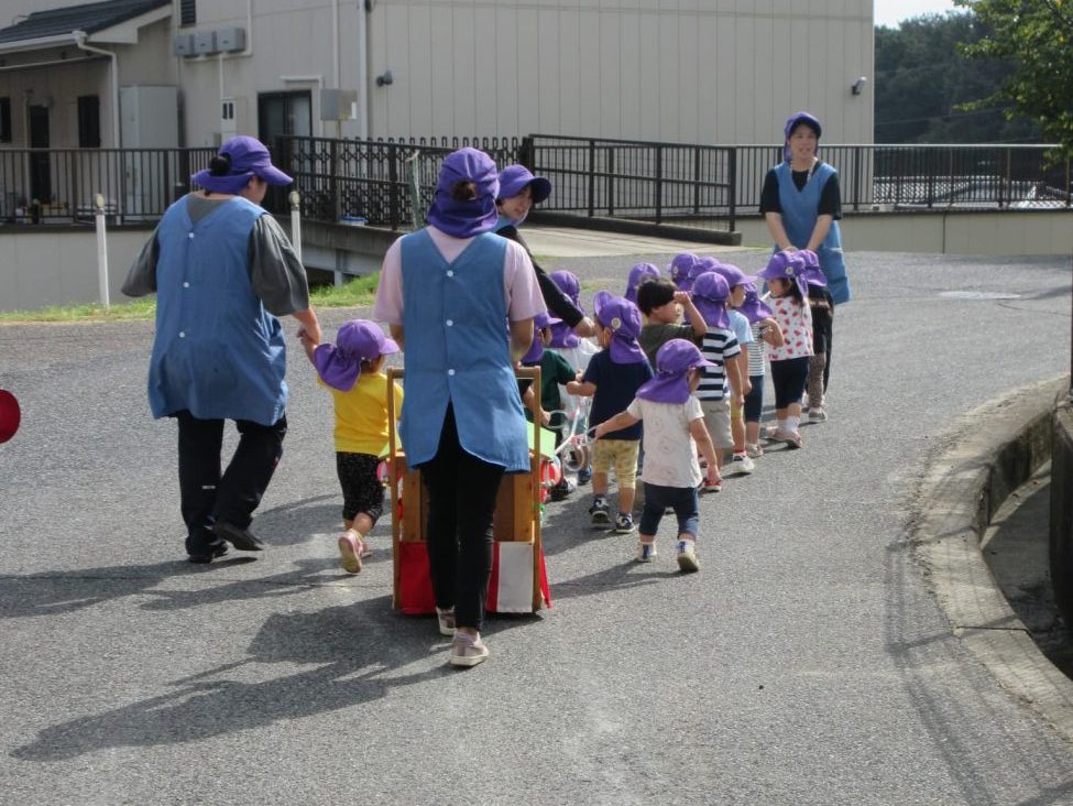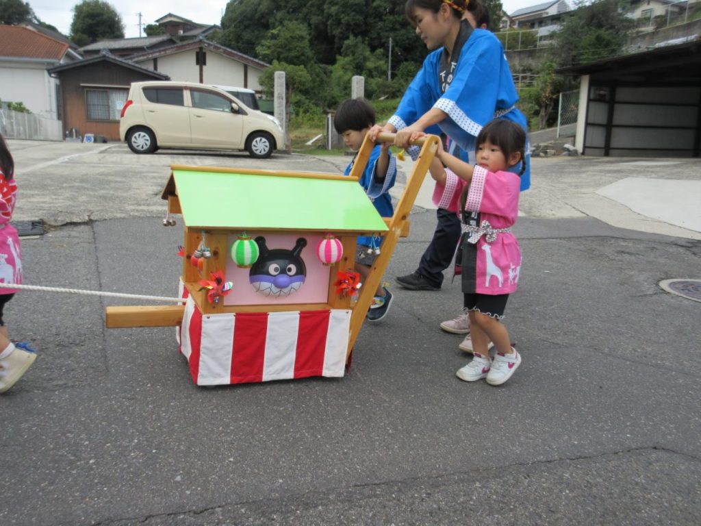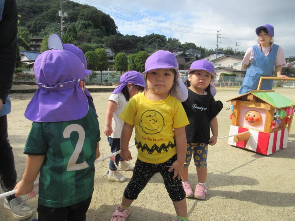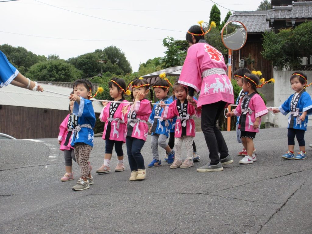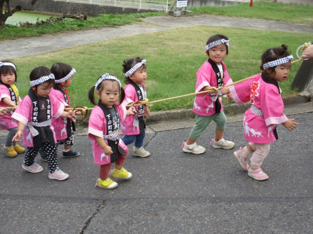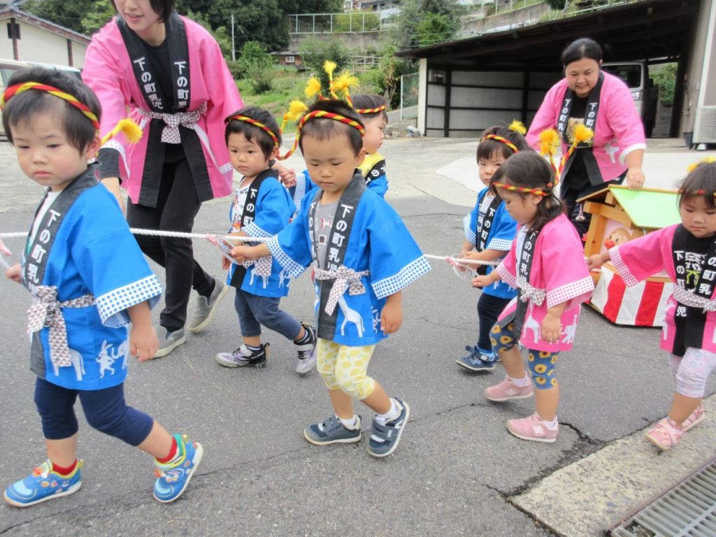10月8日(水)だんじりを引いて歩く練習をしました。ロープのリングをしっかりと握って、園と朝間公園を往復しました。先生のかけ声を真似て声を出す姿も見られていました。