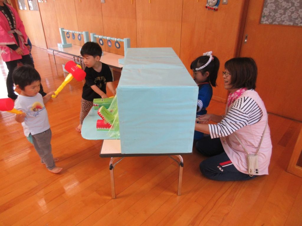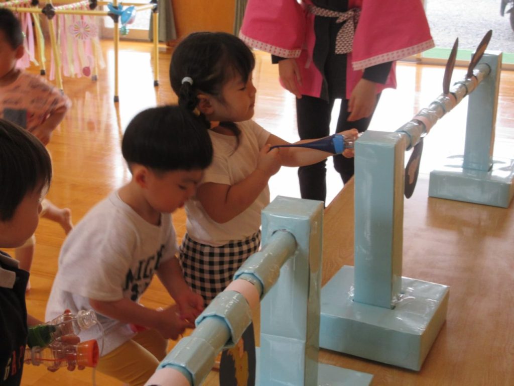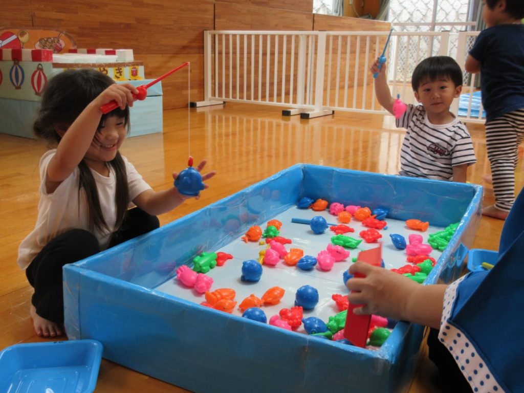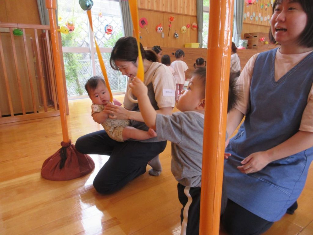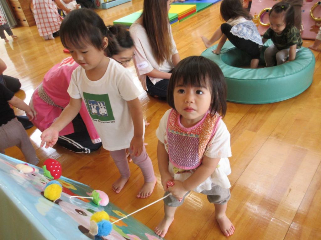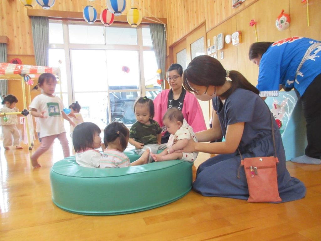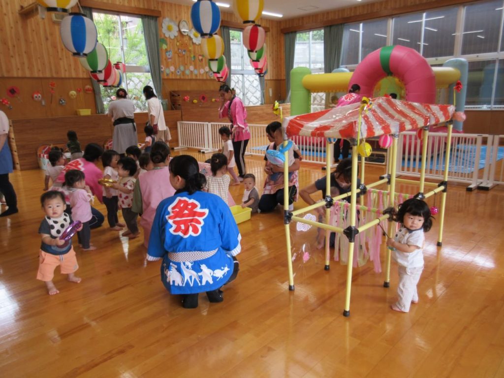 おまつりの飾り付けをした遊戯室で遊びました。園の子どもたちだけではなく、まだ保育園に入園されていない地域のお子さまにも事前に声をかけたり、チラシで呼びかけて参加していただきました。
