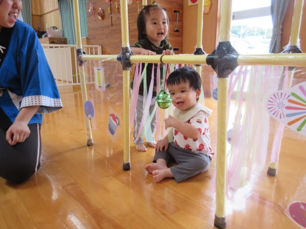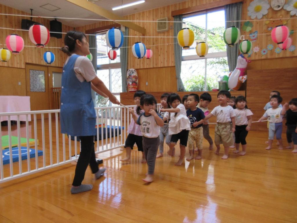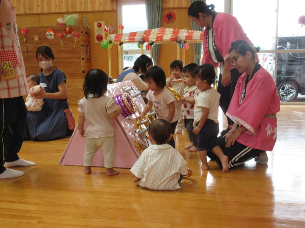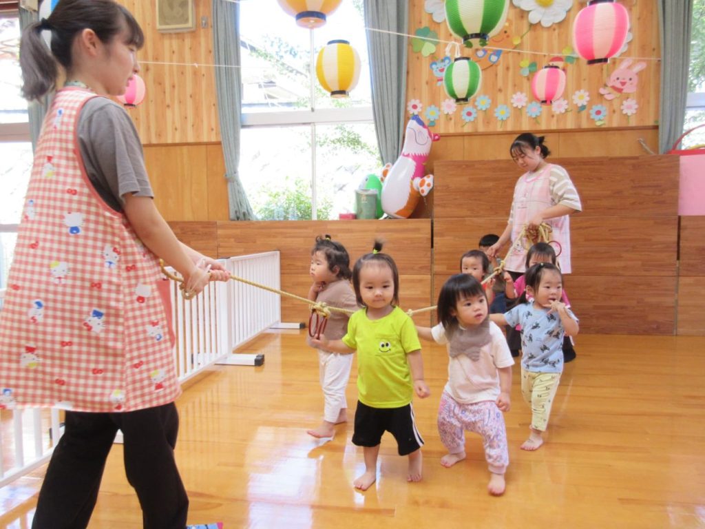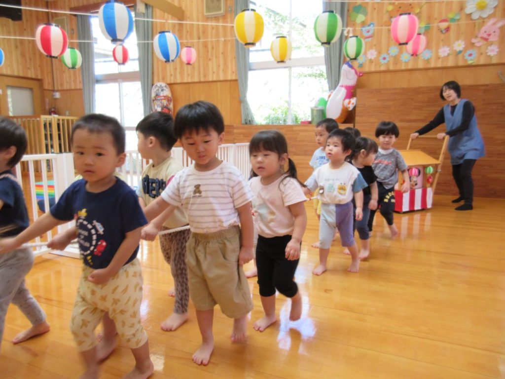 遊戯室に提灯を吊るした中で遊んだり、しゃぎりの音色を聞きながらロープを引っ張って歩き、少しずつ、おまつりに興味をもつ姿が見られていました。
