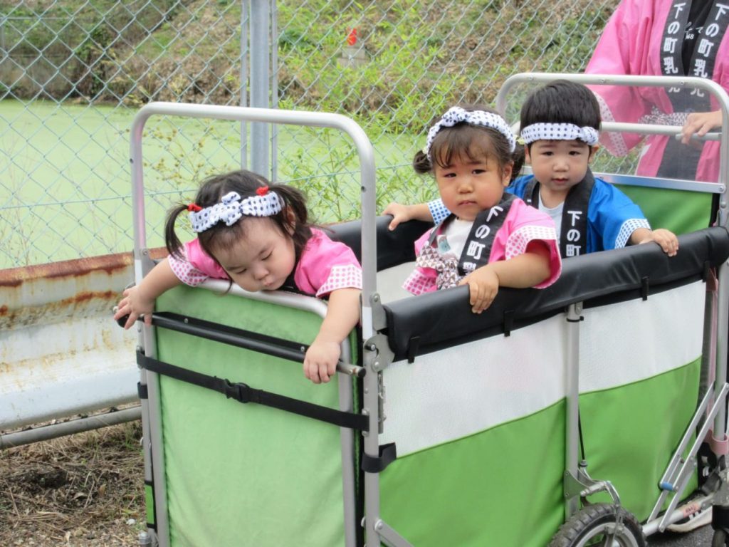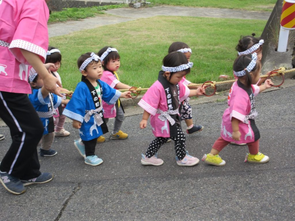 子どもたちと職員は法被とはちまきを着けて参加しました。練習の時よりも、より気合が入った表情で力強く歩いたり、大きな声で「よーい」「さっせ」と先生やお友達と一緒にかけ声を楽しみ、張り切っていましたよ。