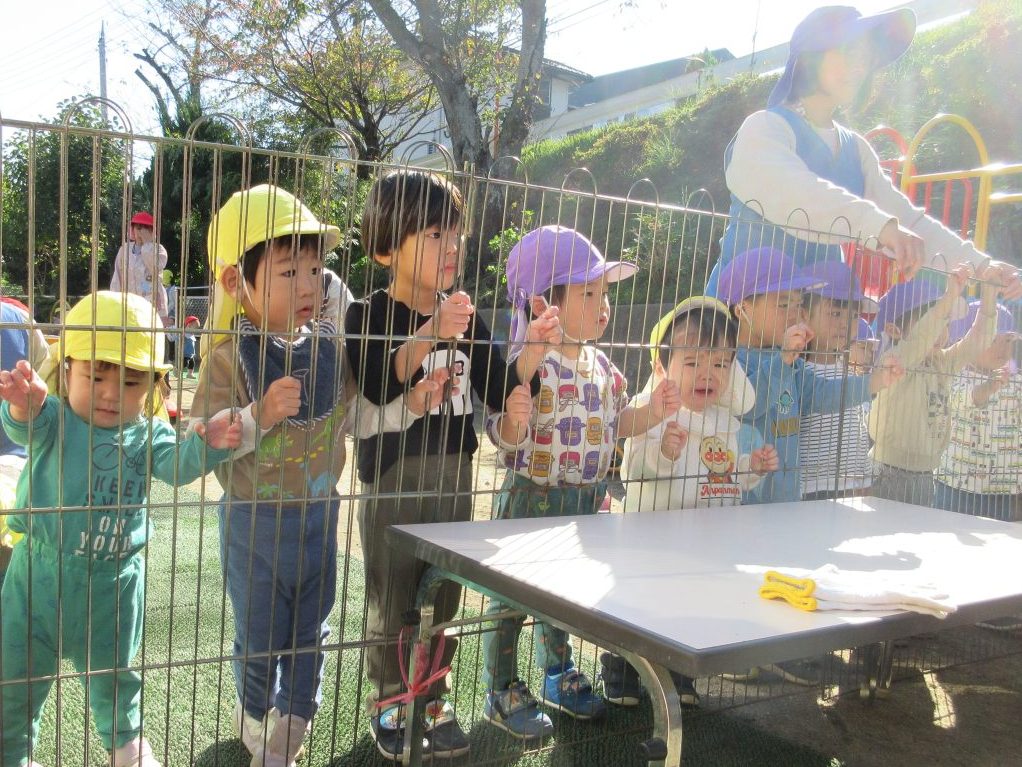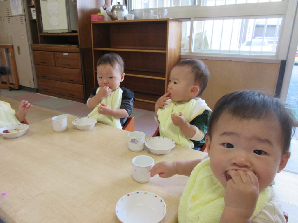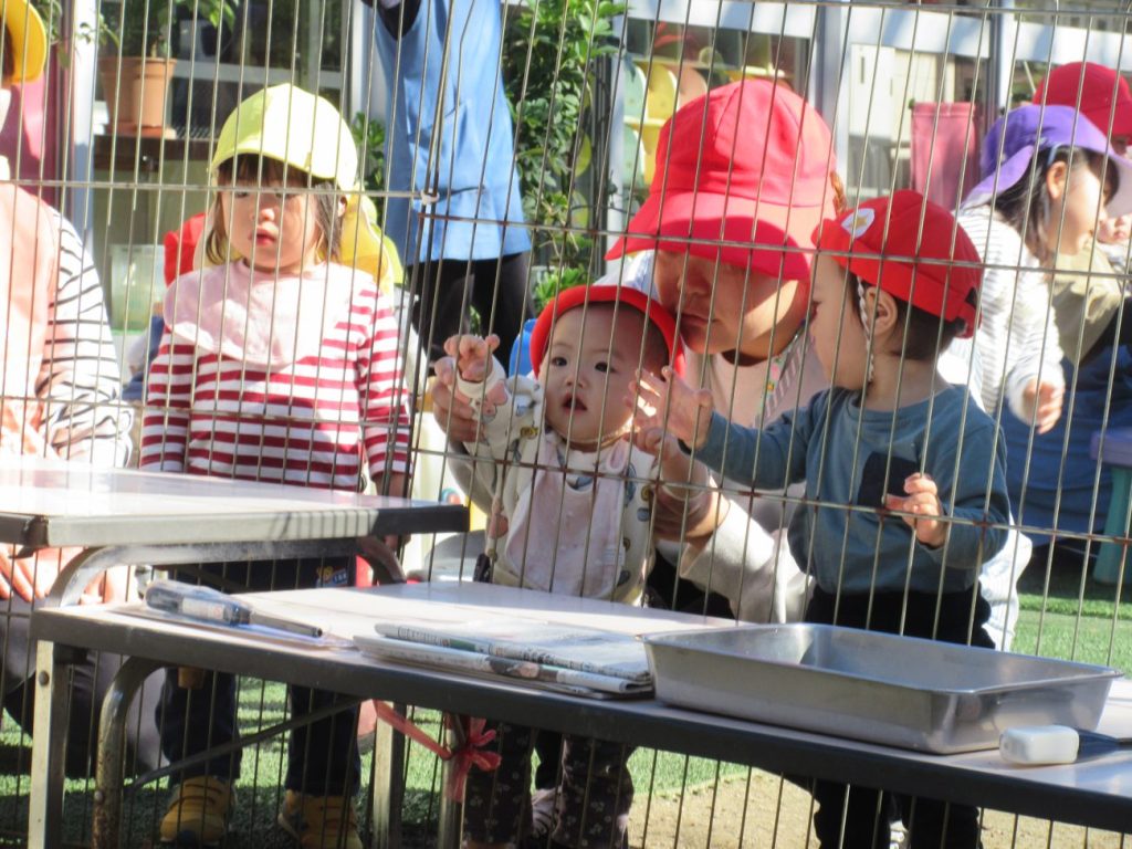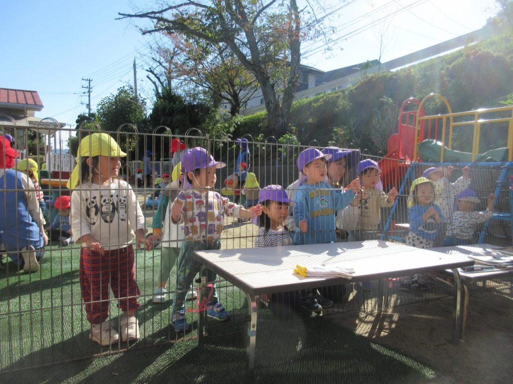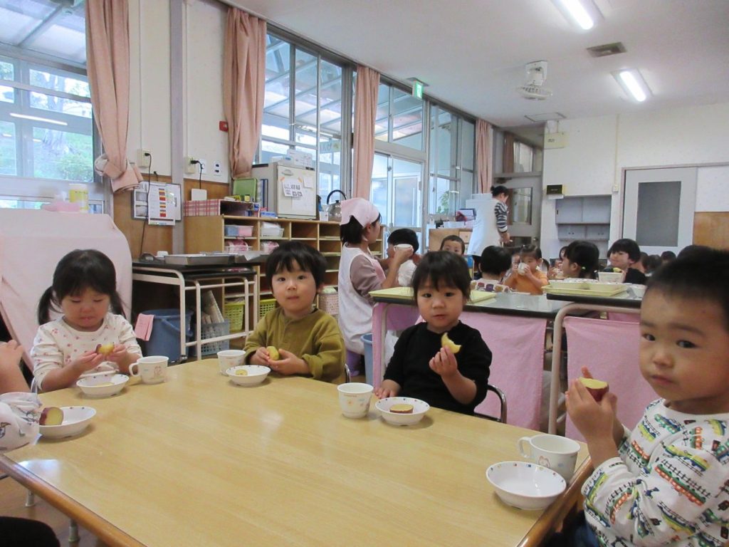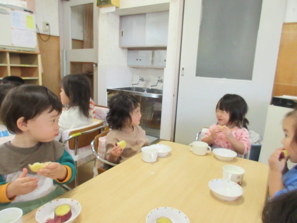 自分たちで掘ったお芋を焼き芋にしました。木が燃えている様子を見て不思議そうに覗き込んだり、煙の臭いをかいでみたりしました。焼いているお芋を見ながら「まだかな、まだかな」とお芋が焼けるのを待っていました。焼けたお芋を見ると「おいもー!」と言ったり、匂いをかいで「いいにおい」「おいしそう」と大興奮でした。
