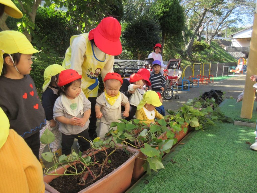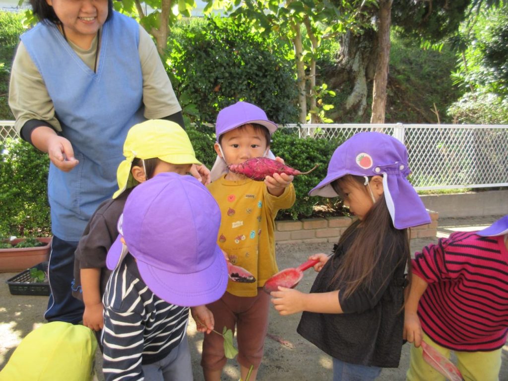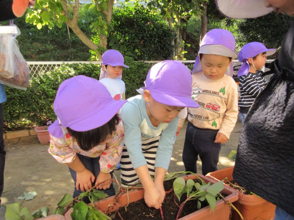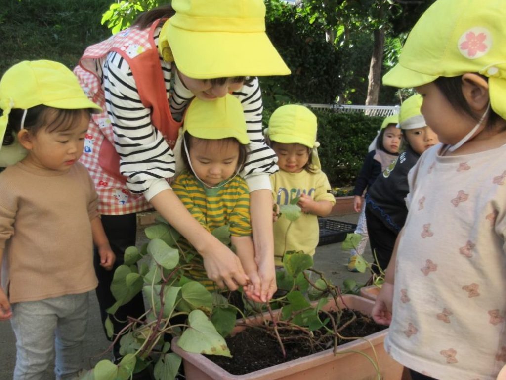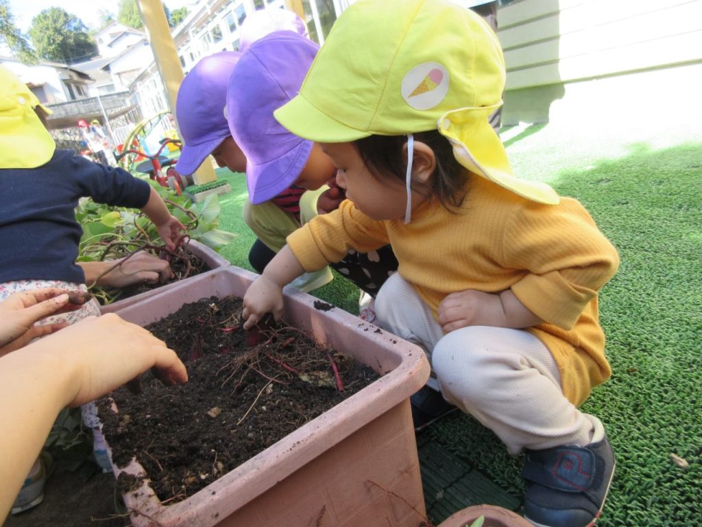 子どもたちは「うんとこしょ、どっこいしょ」のかけ声に合わせ、長いツルを力強く引っ張りお芋ほりを楽しみました。土の中から出てくる、小さなお芋や大きなお芋に驚きながら「大きいのあったよ!」「おいもー!」と先生やお友達と大喜びです。