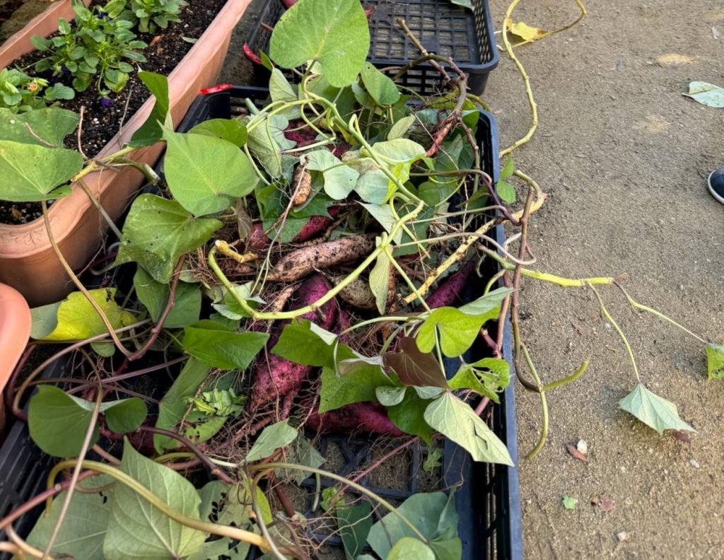プランターや土嚢袋に植えたさつま芋がすくすくと育ち、お芋を掘る季節になりました。