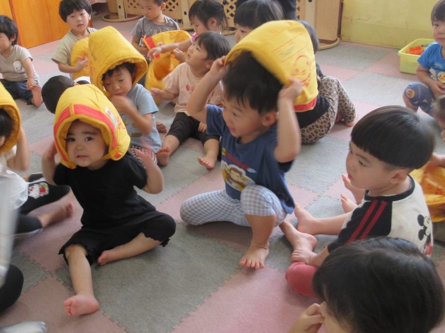 今日は、地震発生時に『頭を低くして身を守ること』『自分で防災頭巾をかぶること』に挑戦しました。子どもたちは、防災頭巾を自分でかぶろうと真剣な表情で取り組みました。