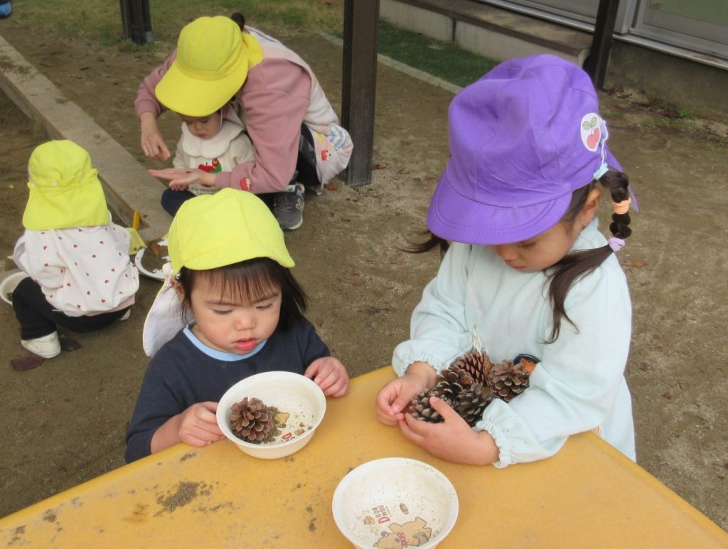 子どもたちは、色づいた葉っぱやまつぼっくりを手にしながら自分の袋に詰め込んだり、ままごと遊びをしたりと先生や友達と触れ合いながら秋の自然物で楽しく遊んでいます。日頃のかかわりの中で、小さいお友達のお世話をすることも学んでいるようです。やさしく自然物を渡してあげる様子がみられ、見ていてほほえましく自然とこちらも笑みがこぼれます。