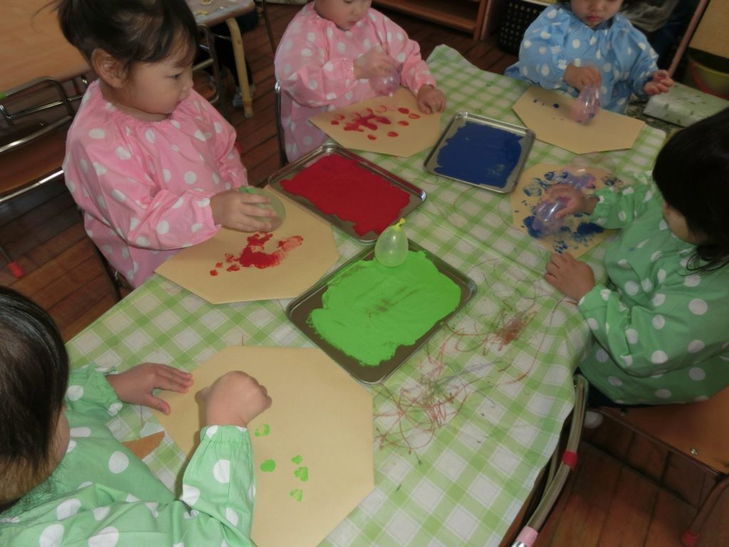 紙袋に、風船と絵の具を使って色を付けました。目や角の模様も自分で描くことができました。「赤が良いな~」「青が良いな~」と楽しみにしながら取り組んでいましたよ。