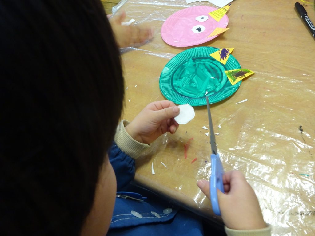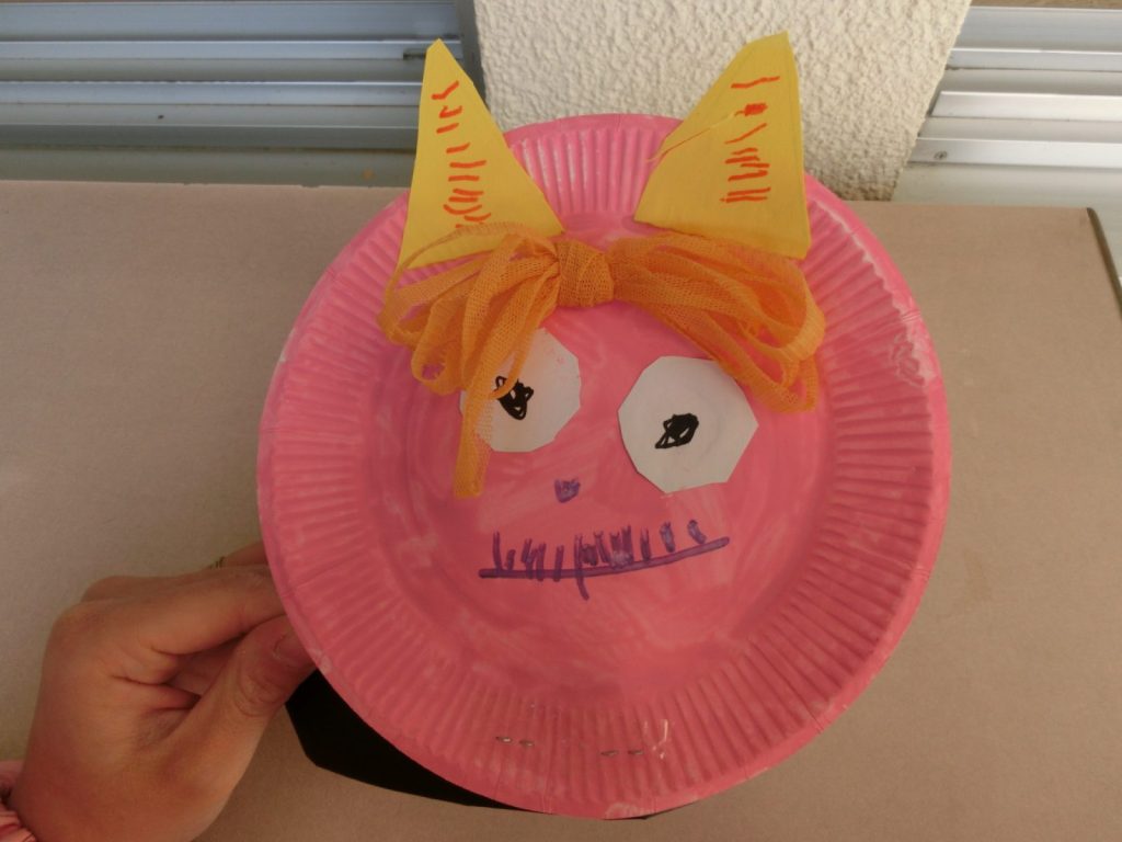 紙皿に好きな色を選んで絵具をぬりました。目の部分は自分でハサミで切って穴をあけました。口や角はそれぞれ想像しながら自分で描いたり切ったりしました。