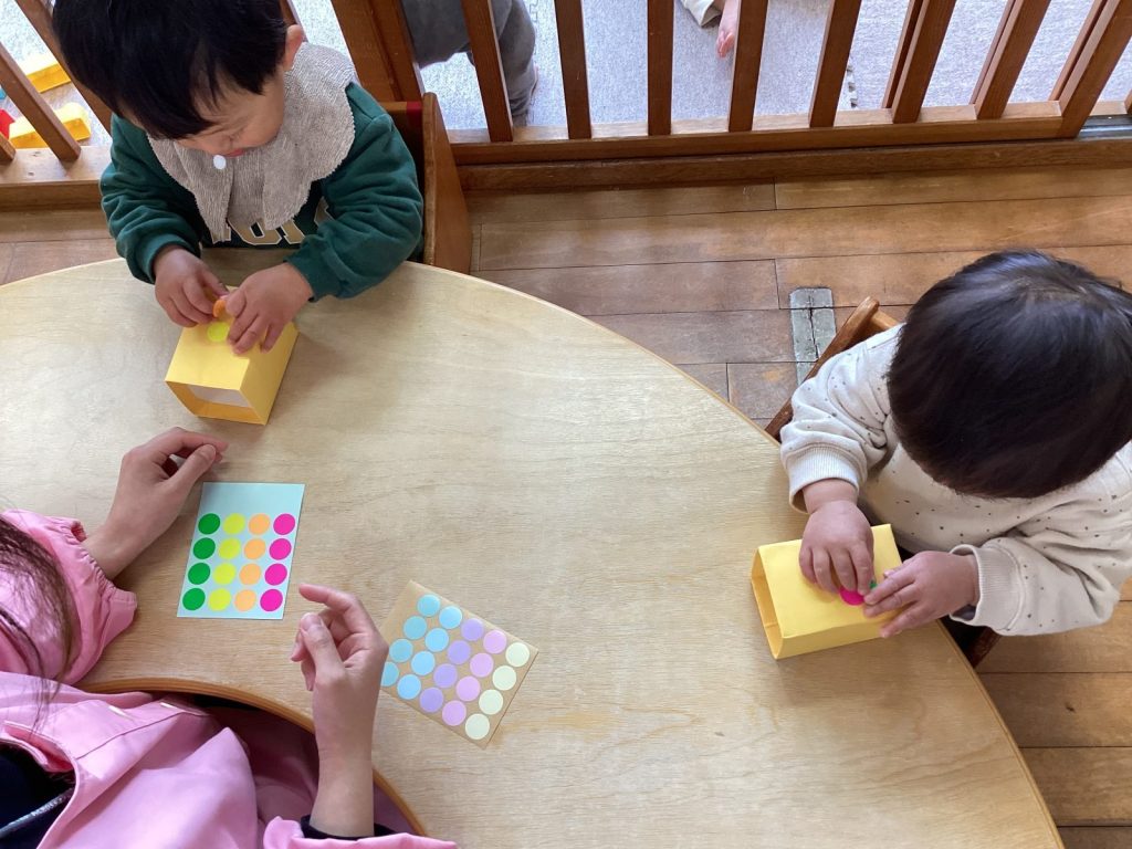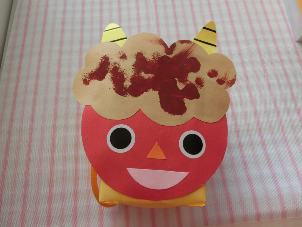 タンポに絵の具を付けて鬼の髪に色を塗ったり、箱にシールを貼ったりして、鬼のカバンを作りました。