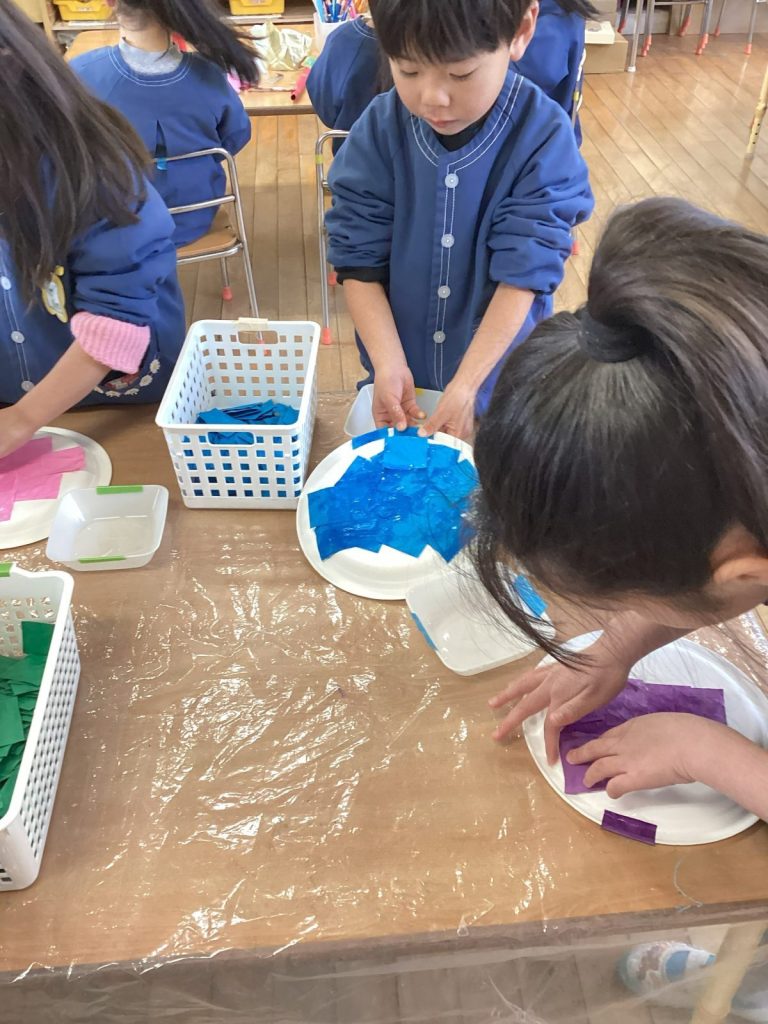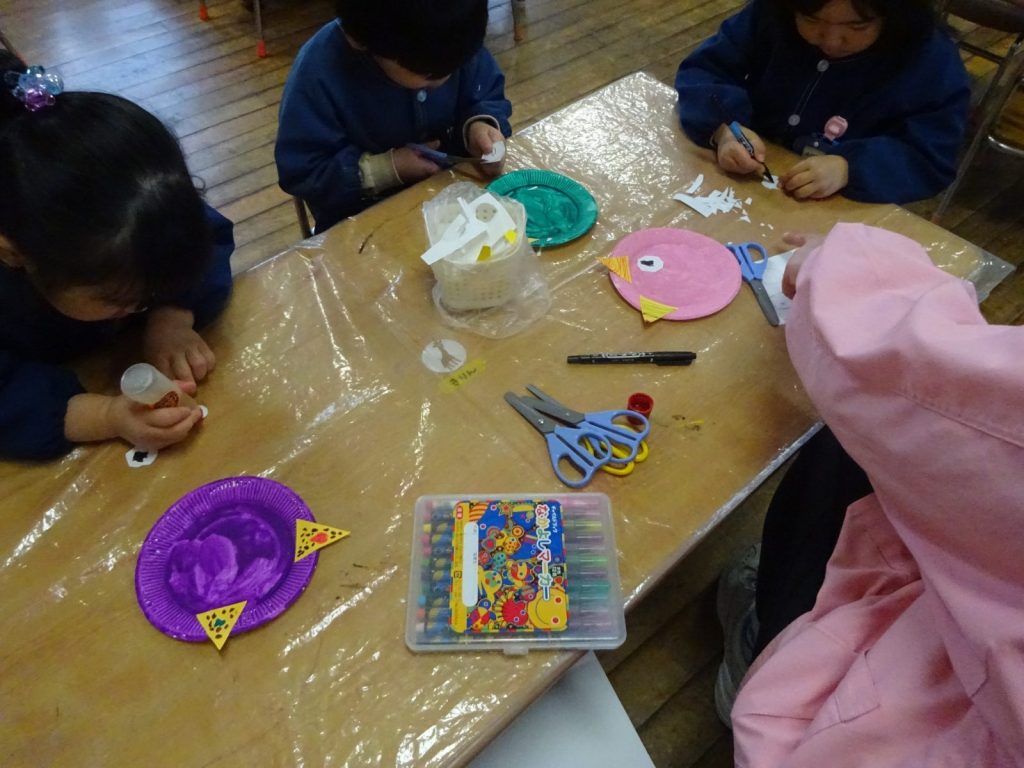 紙皿に小さく切った好きな色の画用紙を重ねて糊で貼っていきました。土台の紙皿が見えないように重ねながら、丁寧に貼って仕上げていきました。目や鼻、角は自分たちで考えてそれぞれで作っています。色々な表情の素敵な鬼面ができました。