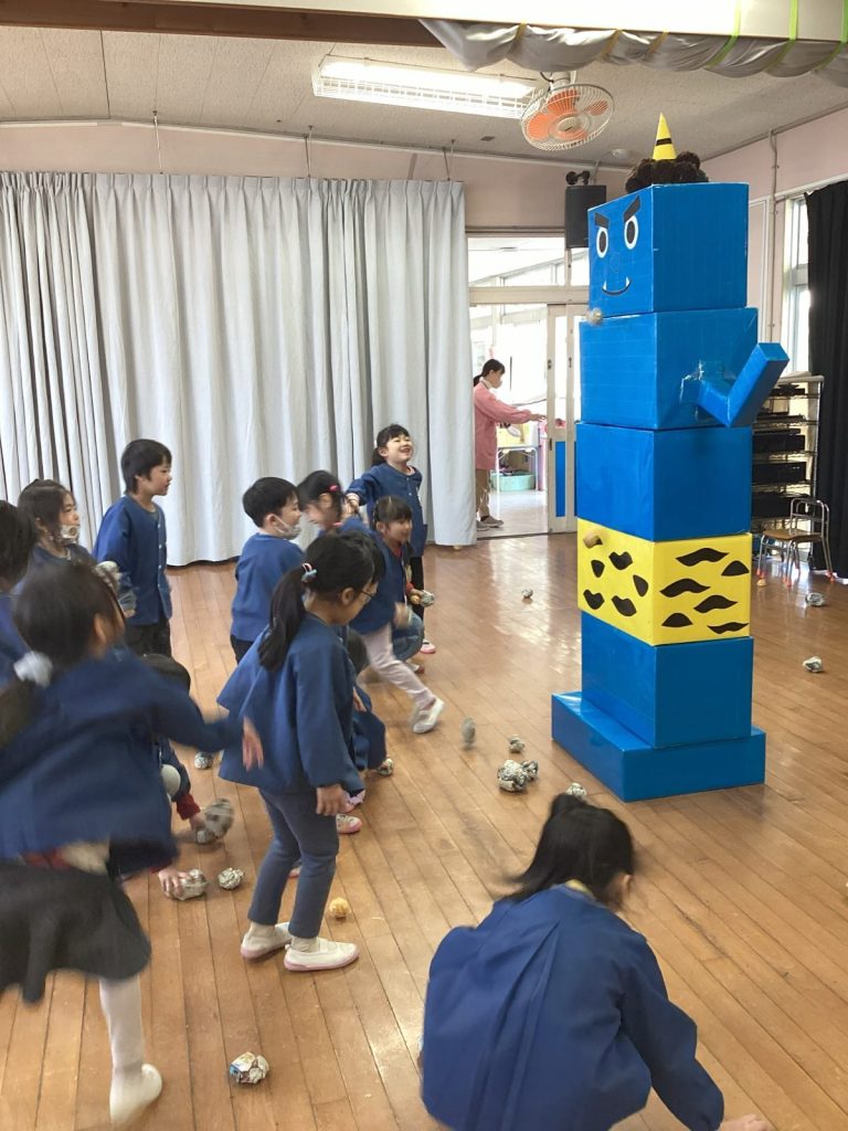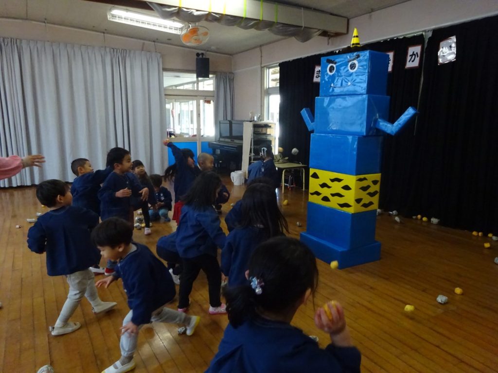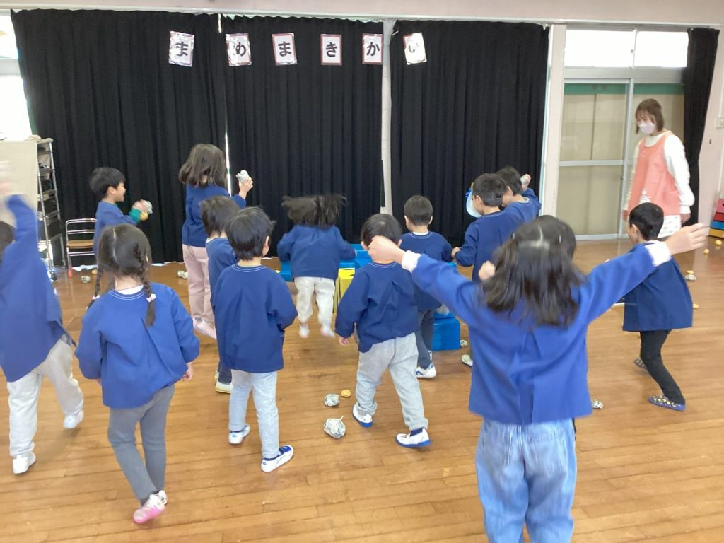 すみれ、たけ、ゆり組さんは遊戯室で。小さいクラスのお子さま方は、部屋でまめまきを楽しみました。