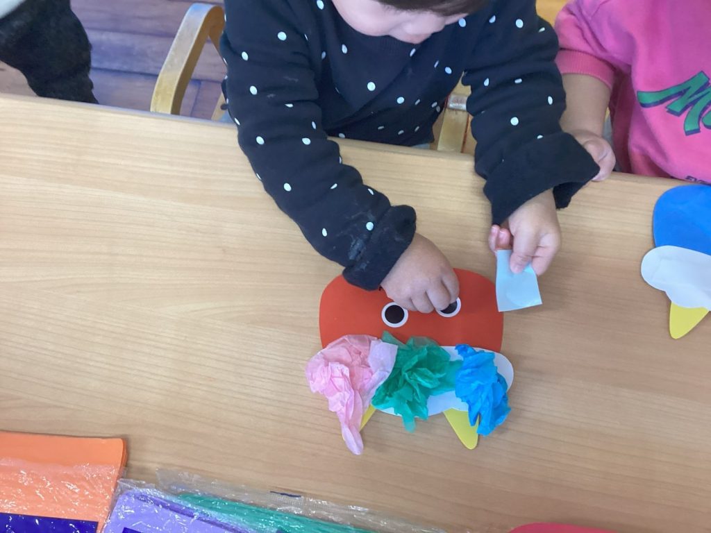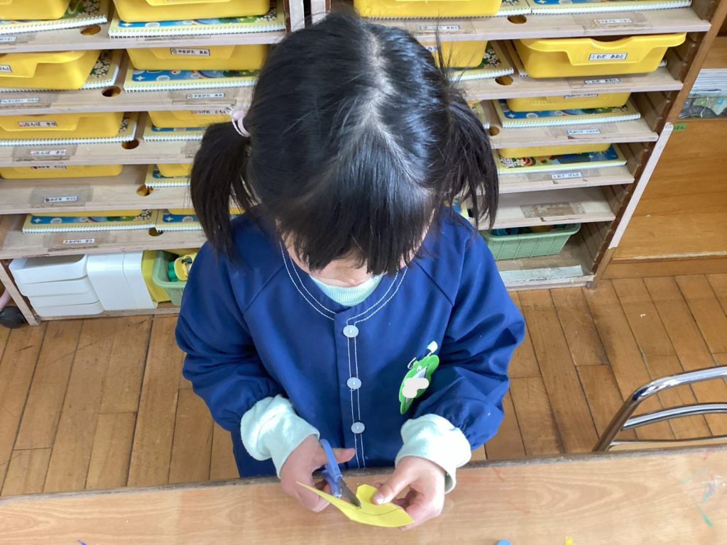 好きな絵の具の色、毛糸を選んで楽しく作りました。目や角は自分ではさみを使って切ることができました。