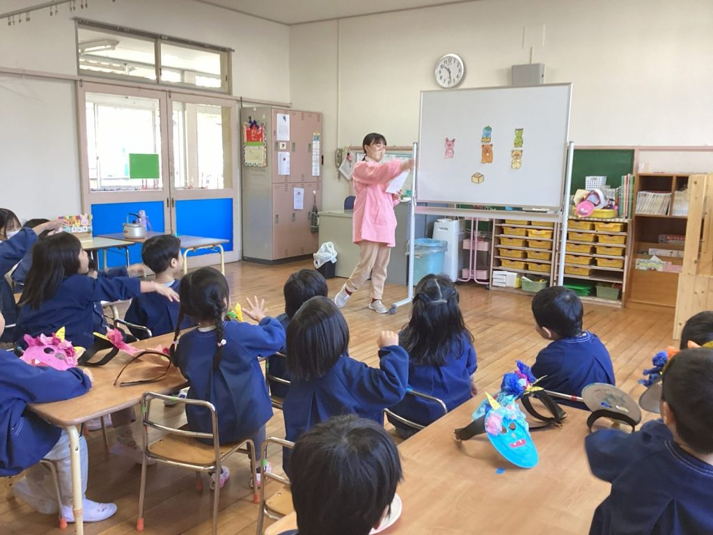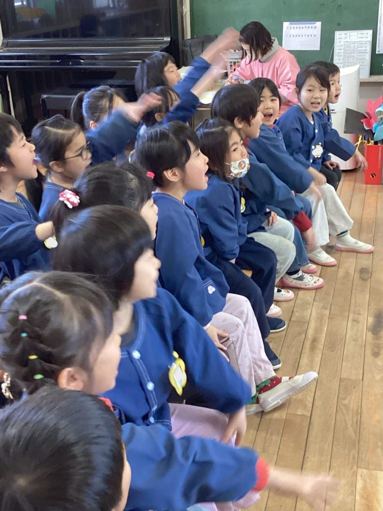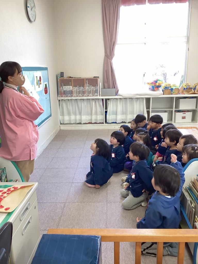 年齢の大きいクラスでは、紙芝居などを見て覚えたこともあったようで、たくさん発言してくれました。クイズも交えながら、楽しく行事に触れていきました♪パネルシアターでは、動物さんたちの中にいる“怒り鬼”“心配鬼”“風邪鬼”などをみんなで一緒に退治しました。