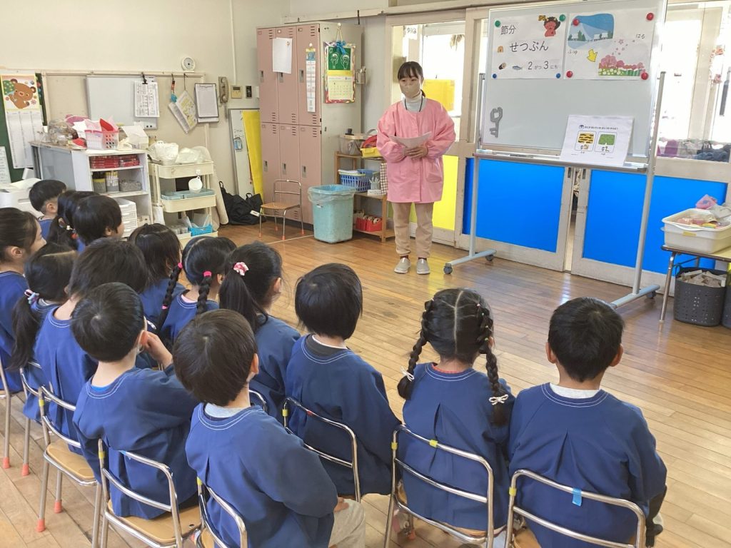 まずは、節分に関するお話を聞きます。(感染症対策のため、クラスごとに行いました)