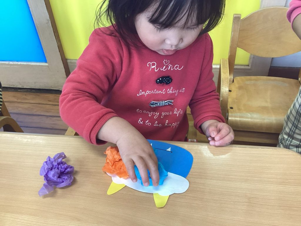 髪の部分は花紙を丸めて貼り付け、目は見本を見ながら目のシールを貼りました。