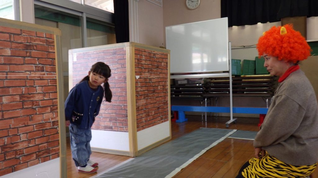 まずは、桃太郎さんと鬼ちゃんの話を聞きました。お子さま方は真剣な表情で、時に笑いながら交通ルールを学んでいました。道路を歩く時には「大人に手首を持ってもらう」こと、建物の間から道路に出るときは、「手前で止まって左右を確認する」こと。そして、横断歩道では「渡る前には手を挙げて、左右を確認し、周りを見ながら渡る」こと。よく覚えていました。