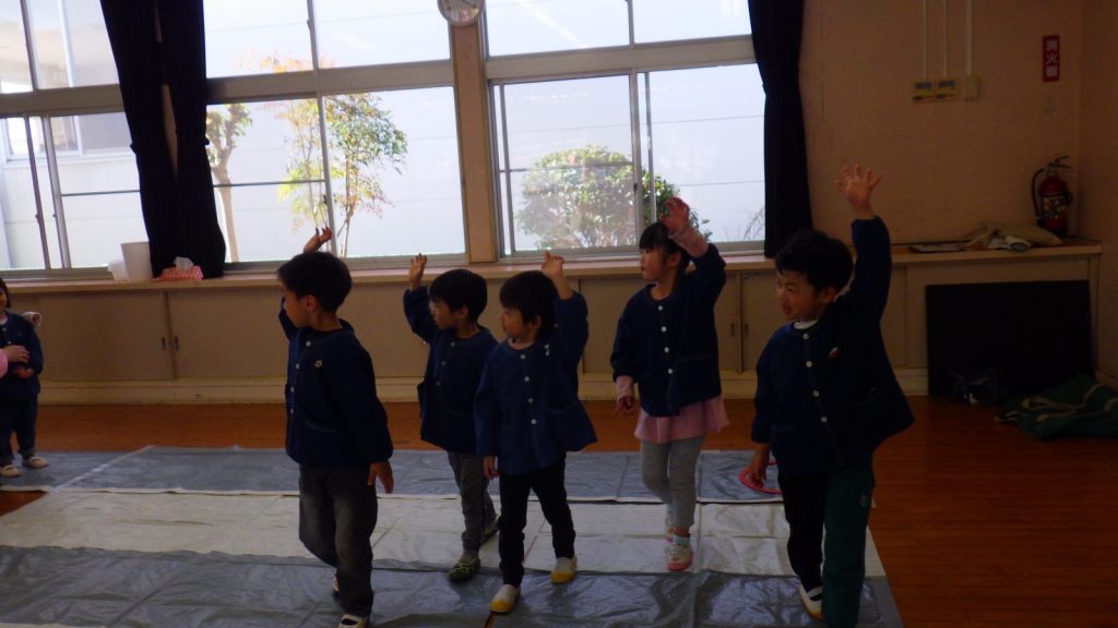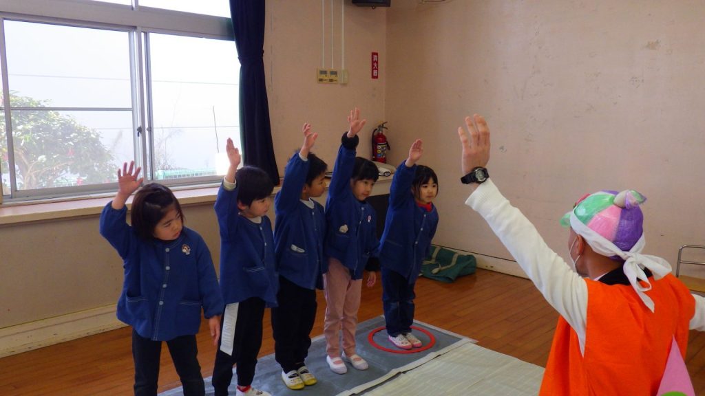 次は、ゆり組さんから3人が前に出て、鬼ちゃんと一緒に傘の使い方を実践しました。危なっかしい鬼ちゃんに、しっかり者のゆり組さんが安全な傘の使い方を教えてあげていましたよ。