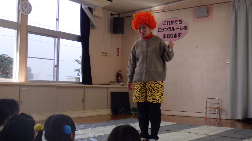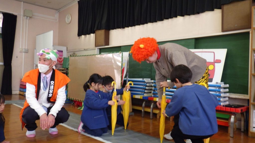 今日は、倉敷市交通安全課の方がきてくださり、ゆり組・たけ組で今年3回目の交通安全教室を行いました。信号の見方や横断歩道の渡り方などを、桃太郎と鬼に変身して寸劇を交えながら教えていただき、楽しく学ぶことができました。