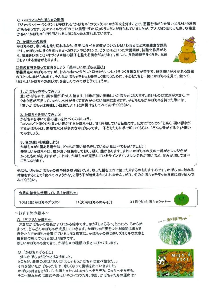 新米や秋の果物など、実りの秋を迎えています。秋は1年を通して、1番食べ物の美味しい季節です。子どもの頃から食べ物の旬を知り、多くの食材に触れ合う機会を作ることは、豊かな感性や味覚形成にとても重要です。今月は給食にも、さつま芋・里芋・きのこ類・柿など、旬の食材をふんだんに取り入れています。